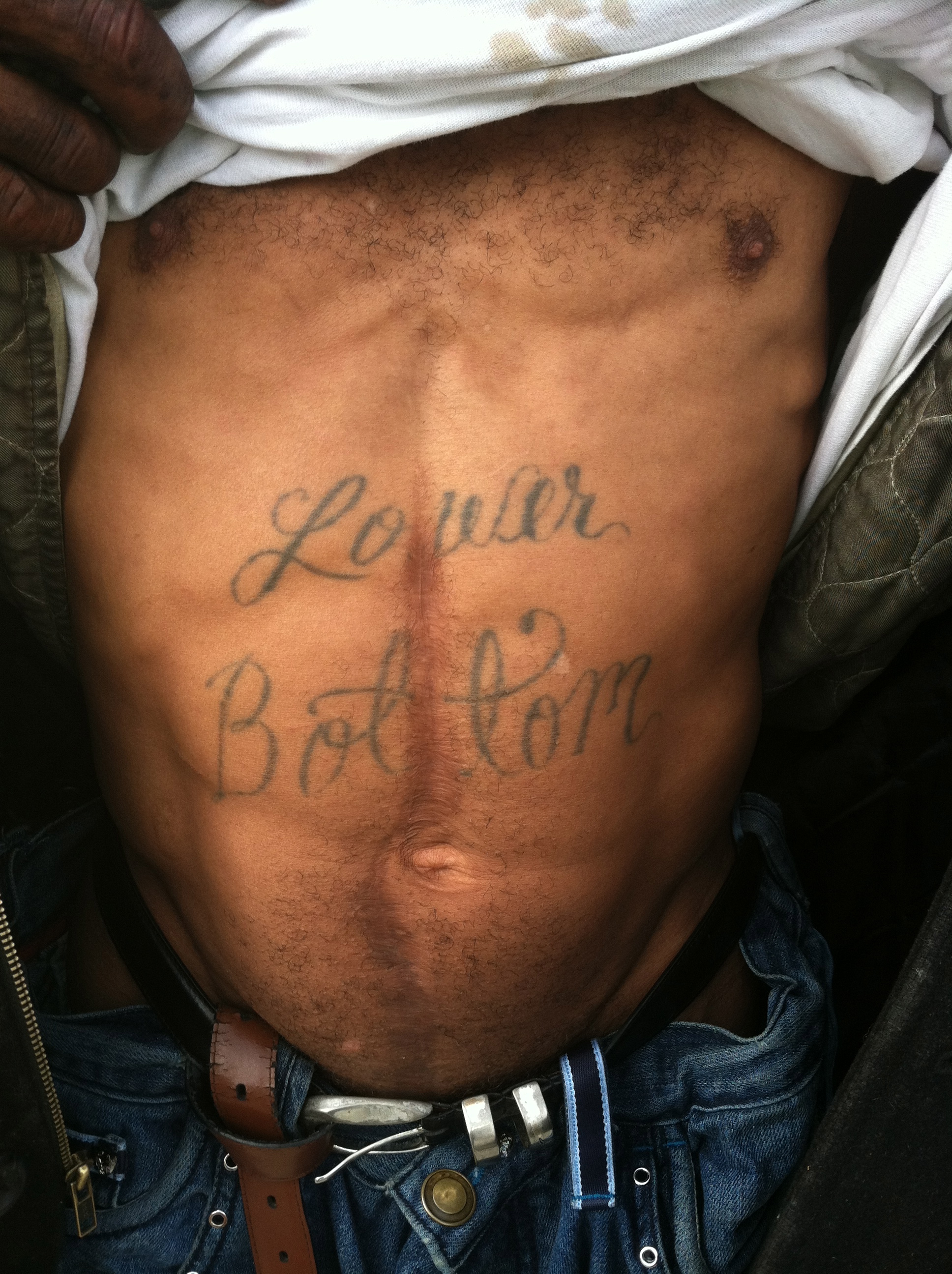 One day I ran into him by the dumpster and  I was like, “Where you been?” He was like,   “I gots shot. Been in the hospital for ten days.  Then they put me in rehab, but I was like fuck that shit. You know you can’t hold a player down. You wanna see where they shot me?”
